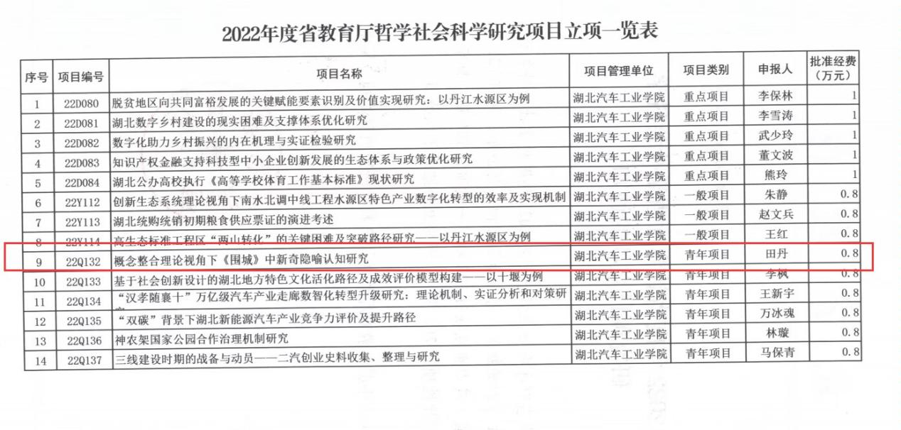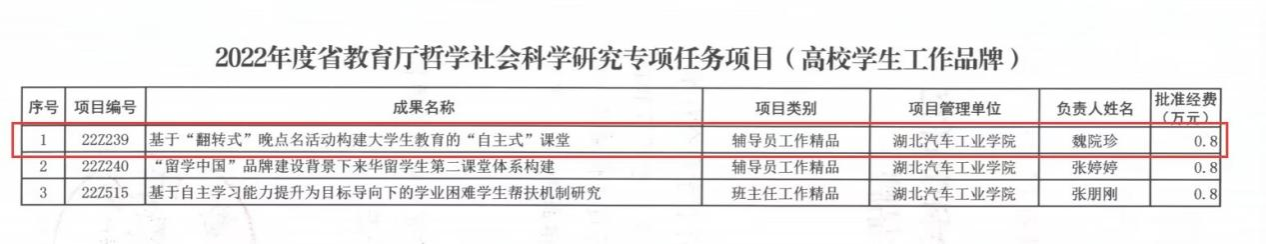 近日,根据湖北省教育厅《关于2022年度省教育厅哲学社会科学研究项目立项的通知》,经专家评审及面向社会公示,我院田丹老师喜获2022年湖北省教育厅哲学社会科学研究青年项目立项(项目编号:22Q132),魏院珍老师喜获2022年湖北省教育厅哲学社会科学研究专项任务项目(高校学生工作品牌)立项(项目编号:22Z239)。