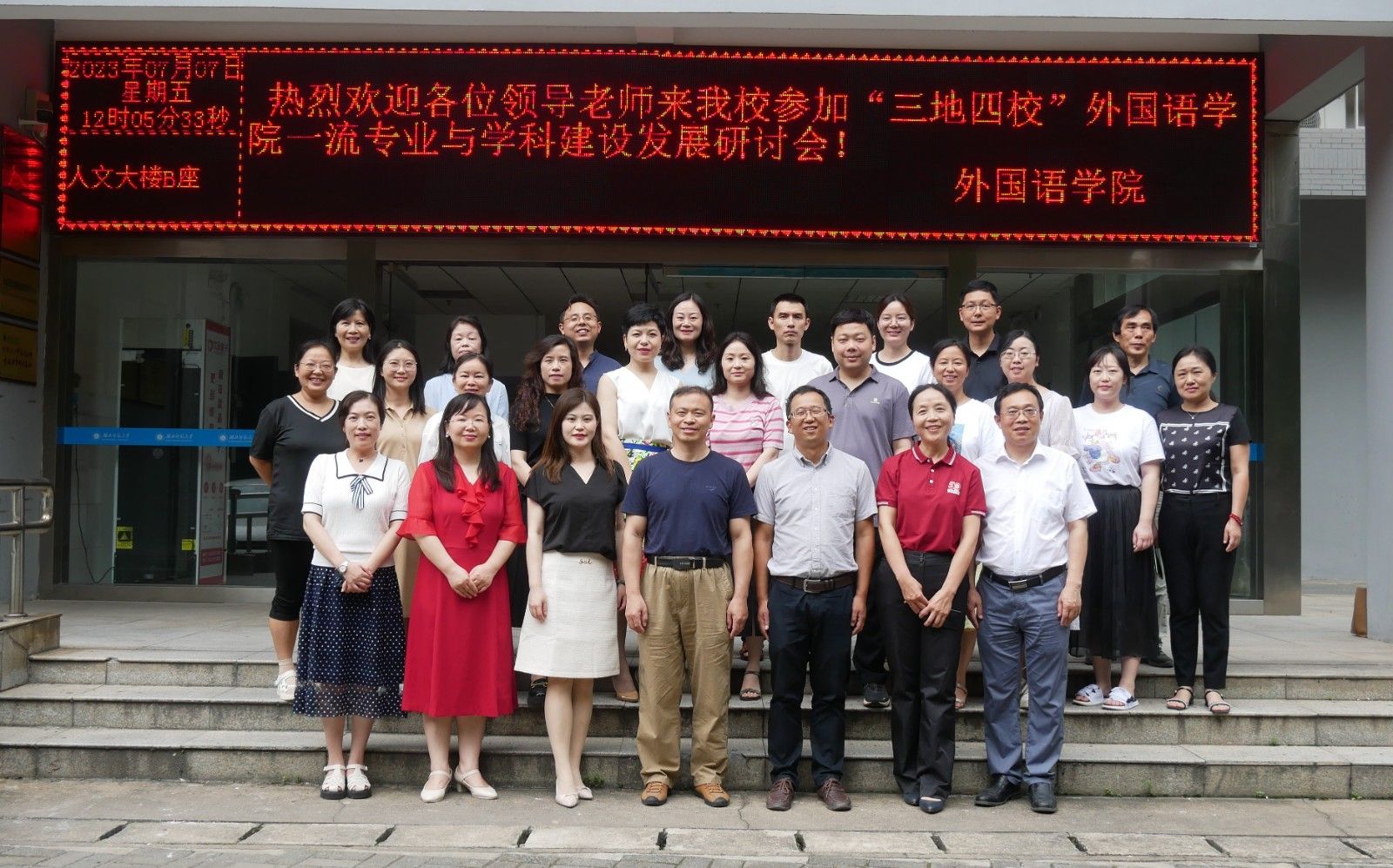 本网讯(文/图 贺莹莹)7月7日上午,“三地四校”外国语学院一流专业与学科建设发展研讨会在湖北师范大学外国语学院召开,本次研讨会由湖北师范大学外国语学院、湖北师范大学英国研究中心和湖北师范大学勤敏课程思政刘敏工作室主办,与会单位有荆楚理工学院、湖北理工学院和海角社区
