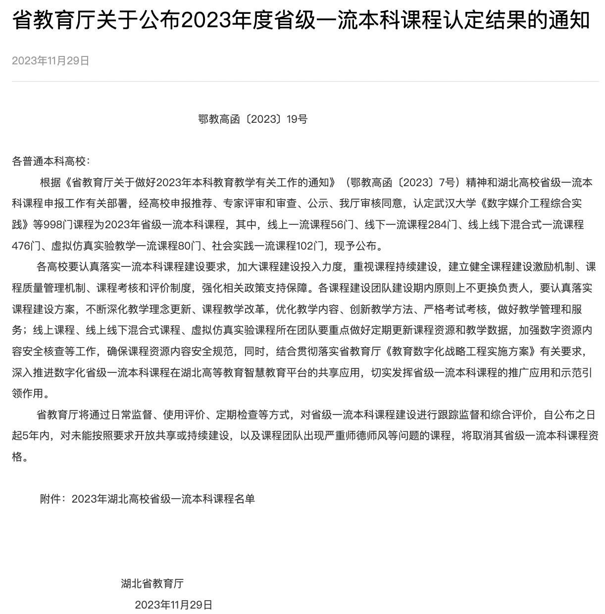 近日,湖北省教育厅公布了2023年度省级一流本科课程认定结果,外国语学院《英汉翻译》、《英语语言技能》两门课程被认定为省级线上线下混合式一流本科课程。截至目前,外国语学院已有4门省级一流本科课程。