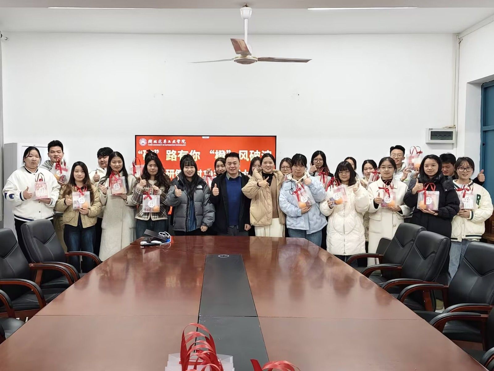 随后,学院领导和老师为考研学子分发精心准备的考研加油大礼包,其中包括寓意心想事“橙”的脐橙、象征好运“旺旺”的旺仔牛奶、“逢考必过”为封面的笔记本以及承载着学弟学妹们美好祝福的卡片,为即将踏上考场的学子们送上了温暖与鼓励。分发礼品后,全体考研学子进行了庄严宣誓,誓言铮铮,展现出他们对考研的坚定信心和必胜决心。大会最后,播放了学弟学妹们专门录制的祝福视频。