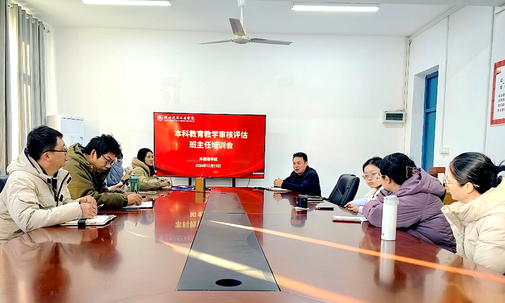 本网讯(文/图 付艳)12月13日下午,外国语学院在学院3503会议室开展本科教育教学审核评估班主任培训会。本次会议由外国语学院分党委副书记魏伟主讲,学院辅导员以及班主任参会。