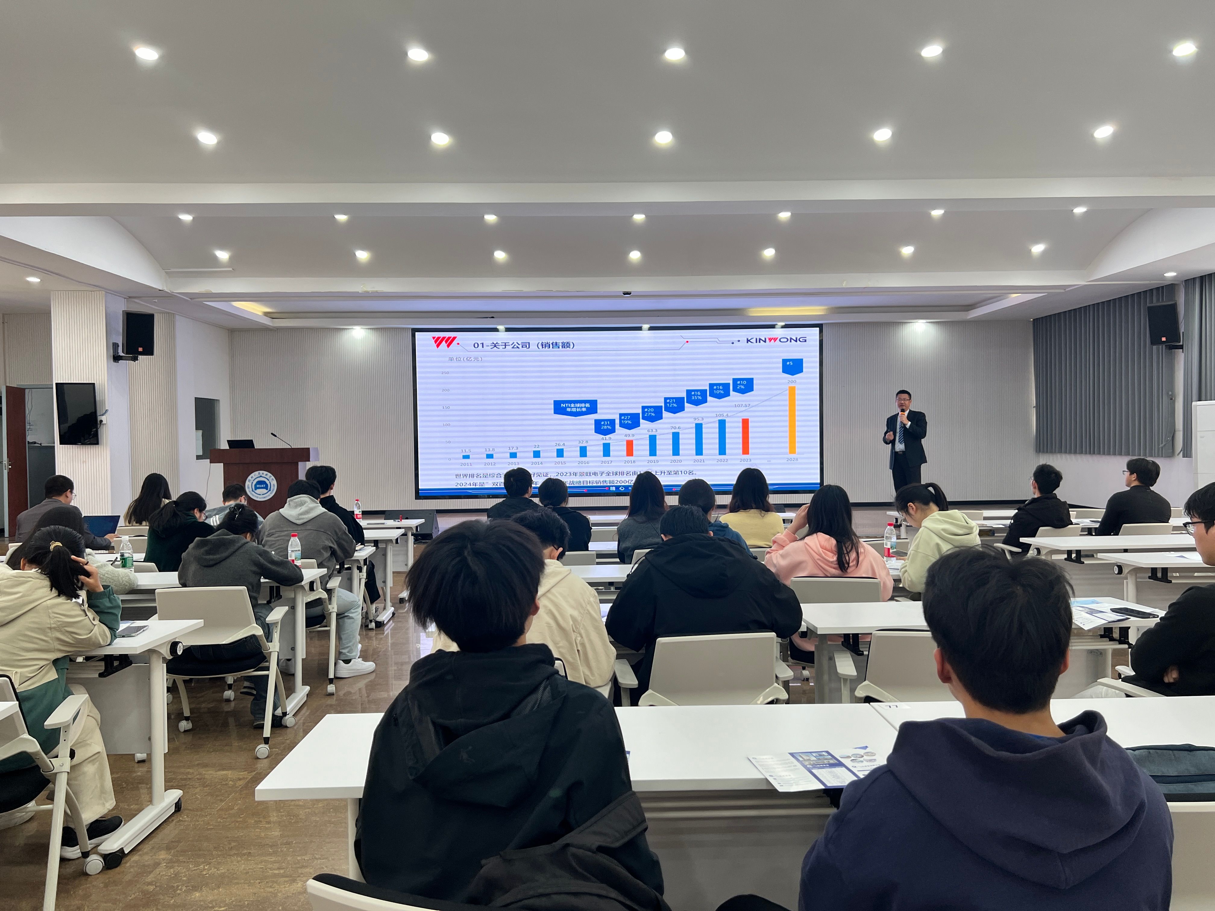 在5101教室成功举办了深圳市景旺电子股份有限公司2025届春季校招宣讲会。本次宣讲会邀请到了深圳市景旺电子股份有限公司人力资源总监王文、市场总监管世超、人力资源经理陈珍珍、人力资源主管刘西青等领导莅临现场,学校招生与就业处处长李新伟、学院辅导员以及21级毕业生参加了此次宣讲会。