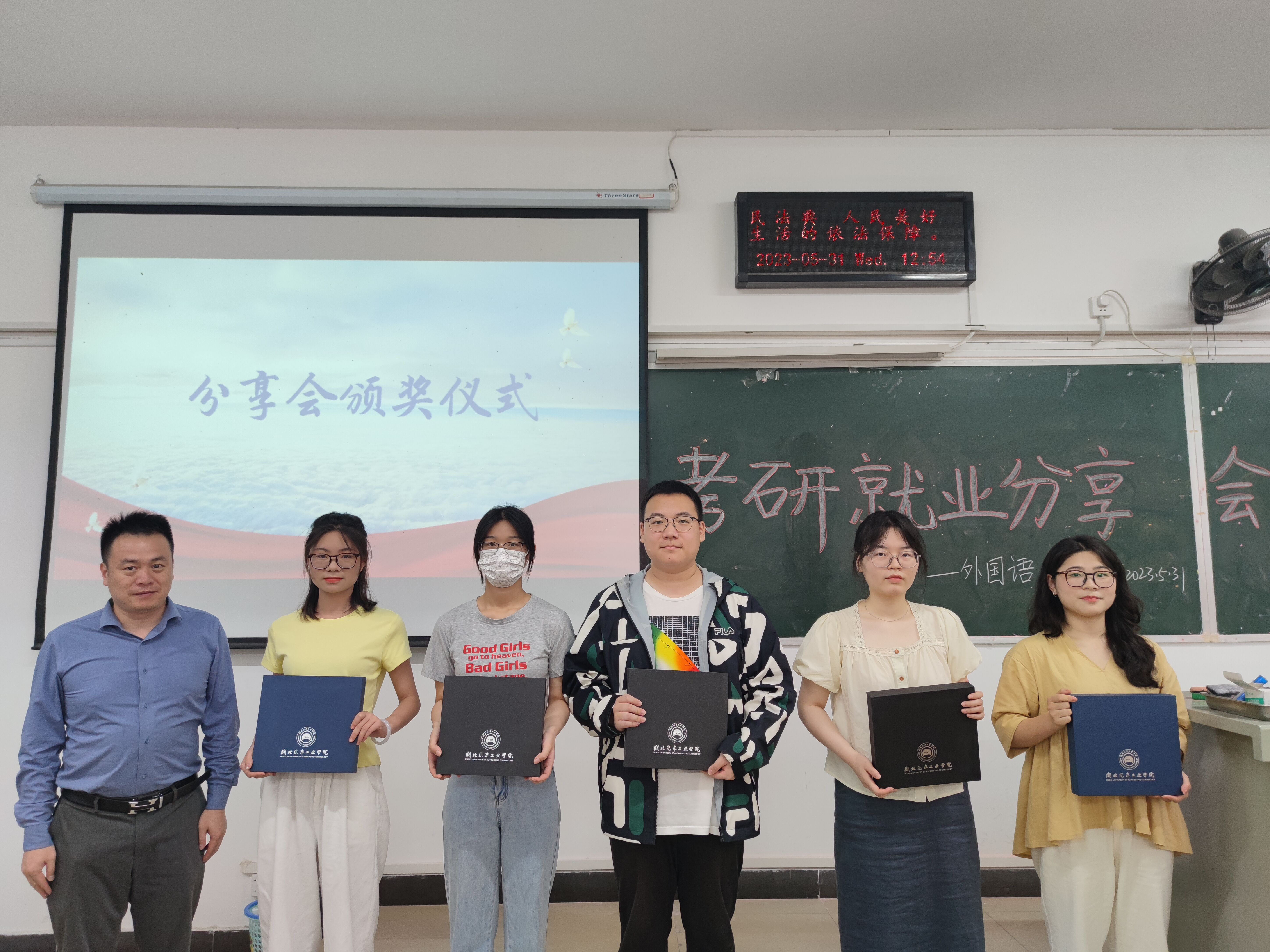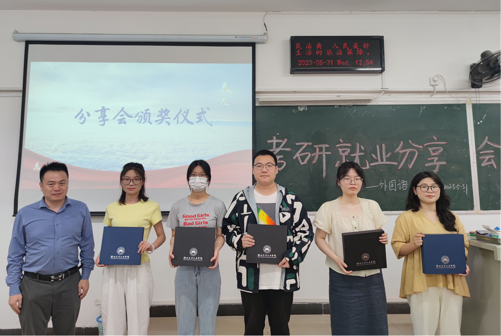 会上,魏伟为五位考研就业优秀代表颁奖。颁奖结束,各位优秀代表分享了考研经验与就业心得,详细介绍了自身的备考方法与指南,耐心地向低年级同学答疑解惑。与会学生纷纷表示通过此次分享会,他们受益匪浅,对考研的认识更加全面,进一步坚定了备考的信心。