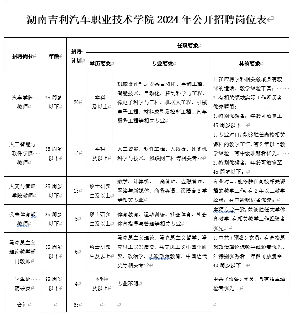 此次招聘岗位6个,招聘计划65名,具体情况见《湖南吉利汽车职业技术学院2024年公开招聘岗位表》。