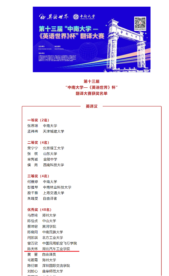 2022年9月30日,第十三届“中南大学--《英语世界》杯”翻译大赛公布获奖名单,我院翻译201班同学陈天林喜获“英译汉”组优秀奖的好成绩。这也延续了海角社区