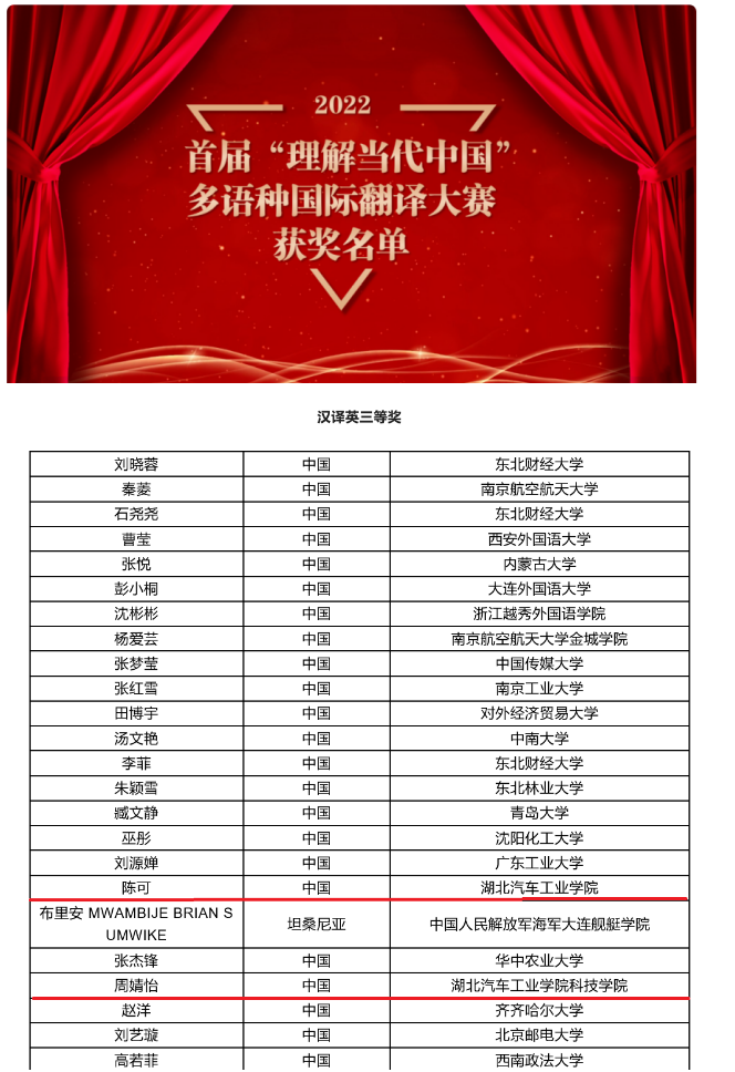 2022年10月30日,首届“理解当代中国”多语种国际翻译大赛公布获奖名单,我院英语202班的同学陈可和科技学院英语203班的同学周婧怡获得了“汉译英”三等奖的好成绩,科技学院英语212班吴梦圆同学获得了“汉译英”优秀奖的好成绩。本届大赛设立英语、法语、俄语、阿拉伯语、西班牙语、日语、德语、朝鲜语、葡萄牙语、意大利语10个语种的汉译外笔译竞赛项目。各语种报名人数共计10147人次,最终提交译文8609份。经过严格的评审流程,包括初审、复审、专家终审三个环节,共评出获奖者432名。