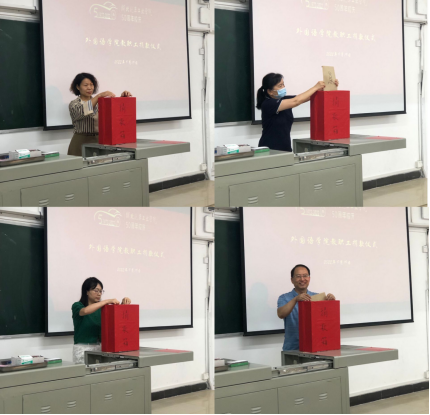 外国语学院庆祝建校50周年捐赠仪式在5203举行。院长朱战炜、书记宋涛、副院长杨荣广、王辰辉出席了捐赠仪式。本次捐赠仪式是一次助力学校又好又快发展的集中捐赠,也是为学校五十华诞献礼,外国语学院全体教职工共同参加了仪式。捐赠仪式由工会主席段艳菊主持,领导和教职工纷纷上台将捐款投入捐款箱,积极为校庆捐献自己的力量。