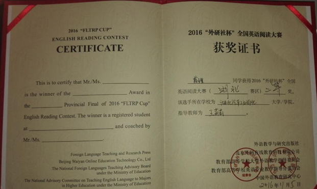 近日,从2016“外研社杯”全国英语阅读、写作比赛组委会传来喜讯,海角社区 2名同学参赛,他们凭借扎实的基本功和较强的思辨能力在比赛中发挥出色、表现优秀,其中蒋理同学荣获“阅读大赛”湖北赛区二等奖;马啸东同学荣获“写作大赛”湖北赛区三等奖。