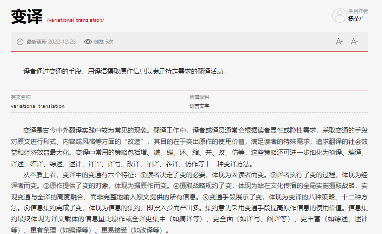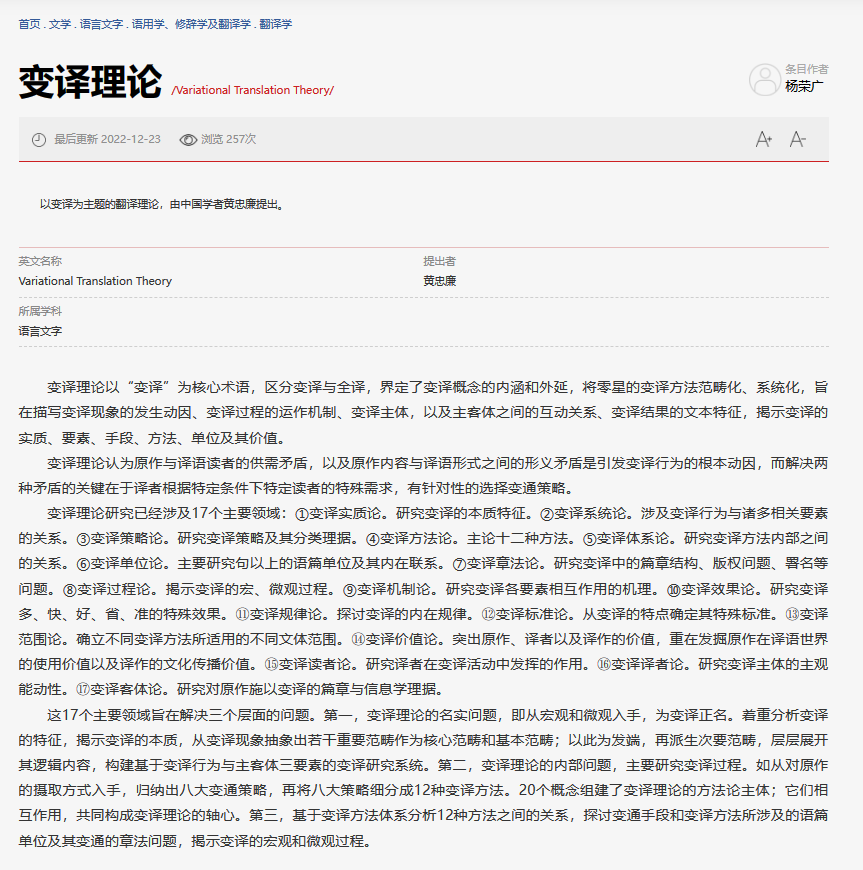 近期,《中国大百科全书》第三版网络版集中发布,其中,变译(variational translation)条目与变译理论条目(Variational Translation Theory)由海角社区