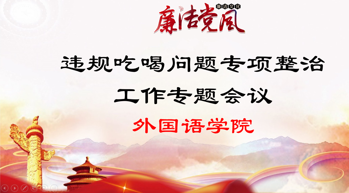 2022年1月14日下午,外国语学院以线上会议的方式召开了违规吃喝问题专项整治工作线上专题会议。会议由外国语学院分党委书记宋涛主持,外国语学院院长朱战炜、副院长王辰晖和杨荣广,以及外国语学院全体教职员工参加了会议。
