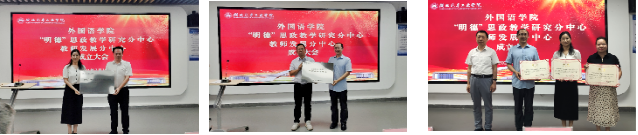 王辰晖教授宣读了《关于成立外国语学院“明德”思政教学研究分中心、教师发展分中心的通知》,成继平教授、郭一鸣教授分别代表学校“明德”课程思政教学研究中心和教师发展中心为两个分中心授牌,王辰晖教授向分中心特聘研究员、分中心特聘顾问和分中心执行主任颁发聘书,外国语学院“明德”课程思政教学研究示范分中心和教师发展分中心执行主任孙媛作表态发言。