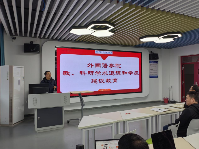 10月21日下午,外国语学院在产教大楼301展开了教、科研学术道德和学风建设教育。会议由副院长翟全伟主持,全体教职工参与了此次学习活动。
