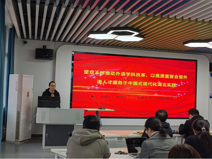 10月21日下午,外国语学院在产教大楼301举办了学习贯彻党的二十届三中全会精神专题党课。院长杨荣广主讲,题为“坚定不移推动外语学科改革,以高质量复合型外语人才服务于中国式现代化湖北实践”。