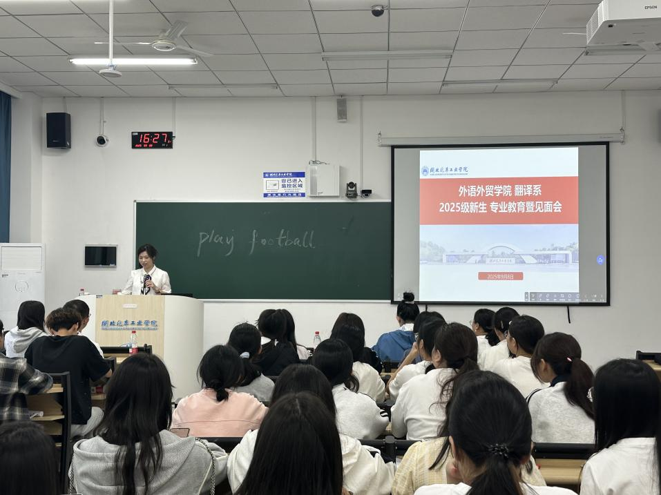 翻译系2025级新生专业教育暨见面会在学院会议室举行。会议以“传承·融合·创新”为主题,通过专业介绍、师生互动、学长分享等环节,为新生开启大学生涯提供全方位指导。