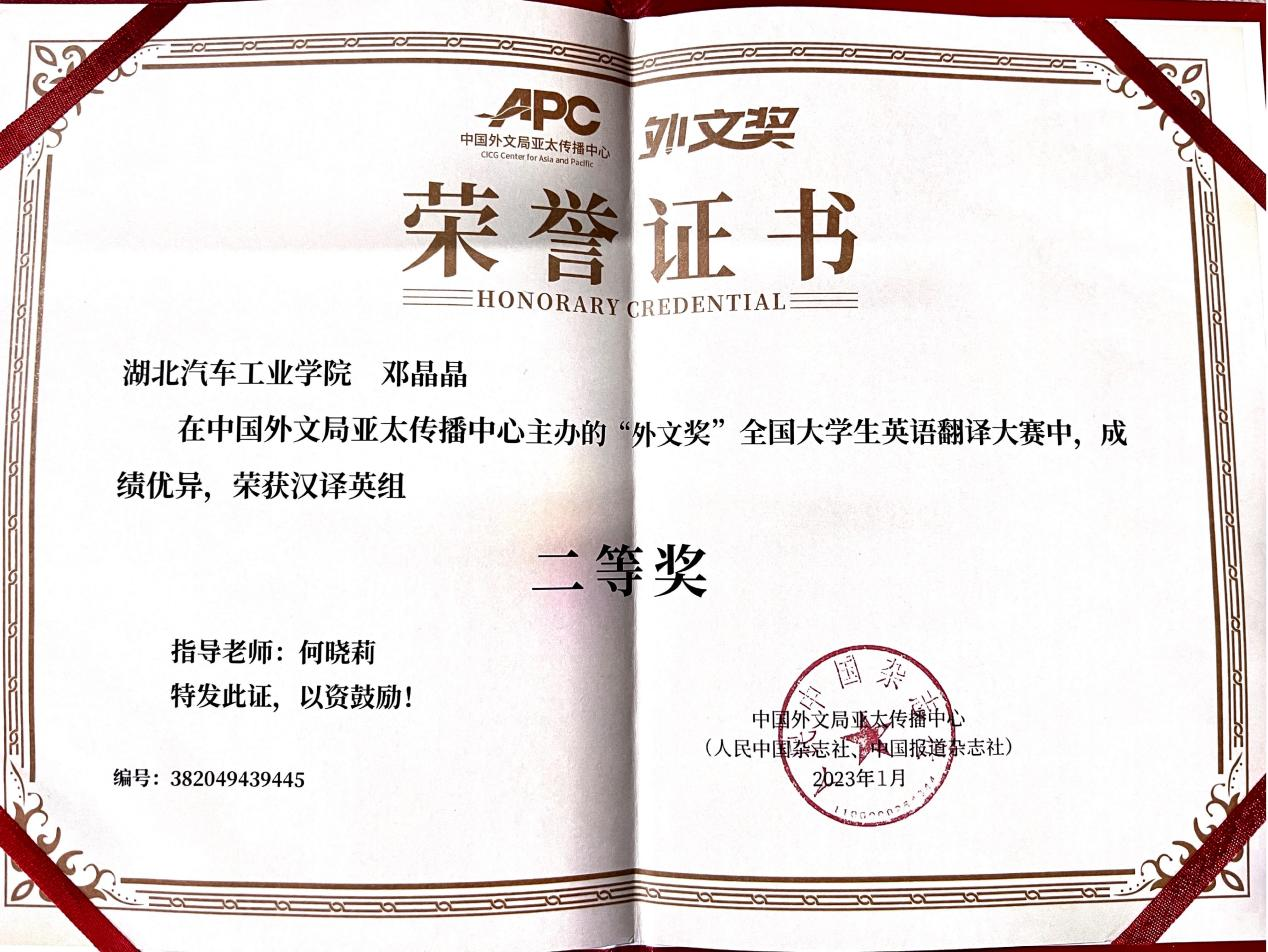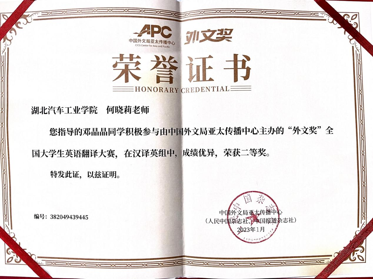 2022年“外文奖”全国大学生英语翻译大赛于1129日结束,大赛共有复旦大学、上海外国语大学、南开大学、北京外国语大学、同济大学等在内的两千多所高校6887名学生参加。经过初评(盲审)、复评(排名)及终评三个阶段的评审,我院翻译201邓晶晶同学获得汉译英组全国二等奖,翻译系何晓莉老师获指导教师奖。